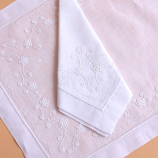 Embroidered Linen Placemats and Napkins Set, French Blooms (Set of 4, Beige or White)