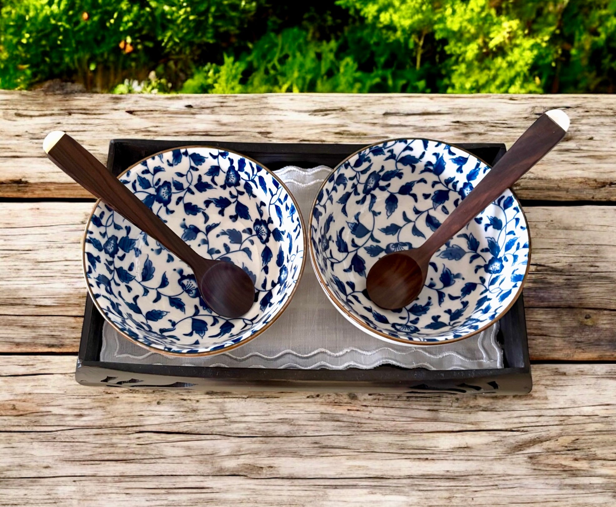 In a timeless blue and white design, this curated tabletop essential, this set includes two ceramic bowls and 2 kamagong spoons adorned with mother-of-pearl, set on a bamboo tray with a soft embroidered doily. Ideal for appetizers and condiments when dining, whether for everyday meals or entertaining.